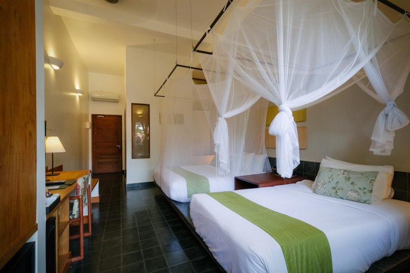 - Deluxe Poolside Garden: 33 sqm, on the ground floor facing lush tropical garden, 01 double bed and 01 single bed, a closed bathroom and a terrace, direct access to the pool