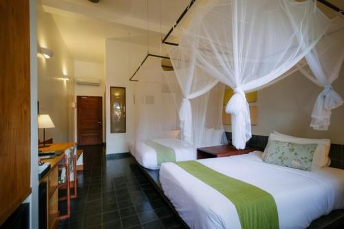 The Plantation Urban Resort & Spa is a 84 charming and colonial style hotel, located behind the Royal Palace and National Museum, in the heart of Phnom Penh. It is set up in a lush and exotic garden with a main 20 meter natural stone swimming pool and red pool & bar. Facilities include restaurant, two bars, spa, fitness and a shop exclusively dedicated to Cambodian products. An art gallery is surrounding a lotus pond in front of the reception.