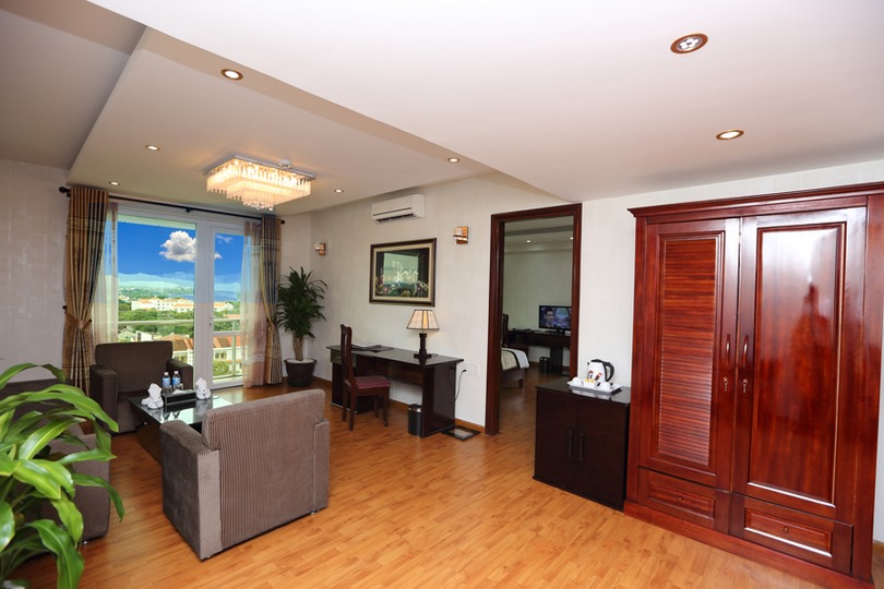 - Suite River View: 64 sqm, Queen bed, living room, private balcony overlooking Huong River, standing bathtub and steambath combination