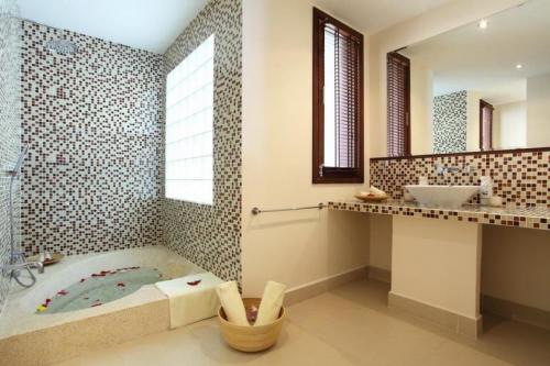- Anantara Garden View Suite: 84 sqm, bedroom with King size bed and adjoining living area, garden view, private balcony with two swing chairs, bathroom with bathtub, separate shower and double vanity units, upper living room featuring an L-shaped sofa and beanbag, lower living room featuring an Asian style daybed