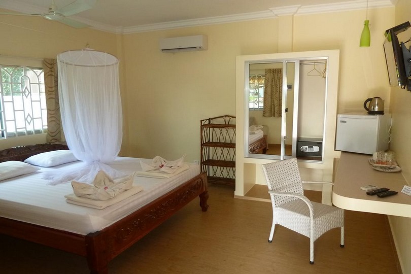 Our guesthouse and resort are right at the beach. It is located between Otres-Beach I and Ochheuteal Beach. You will find a friendly and peaceful ambiance and a romantic beach with stunning sunsets. The large bright rooms and bungalows in our beach resort suffice European Standards. Every room is provided with air-conditioning, refrigerators for cold drinks, fan, hot water, safe box, a basic stock of dishes and WIFI.
